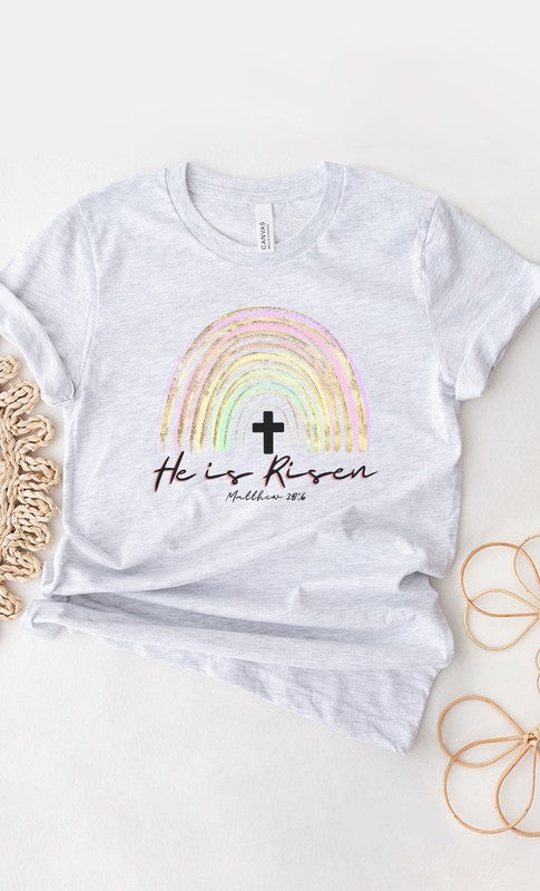 Radiate faith and joy with this vibrant “He Is Risen” tee, featuring a faux glitter rainbow and Matthew 28:6 for a spark of inspiration.