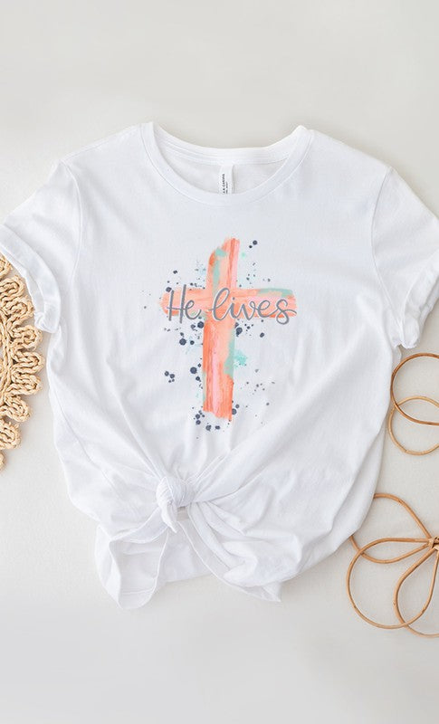 Celebrate the hope of Easter with this uplifting “He Lives” graphic tee, featuring a watercolor cross as a gentle reminder of resurrection and grace.